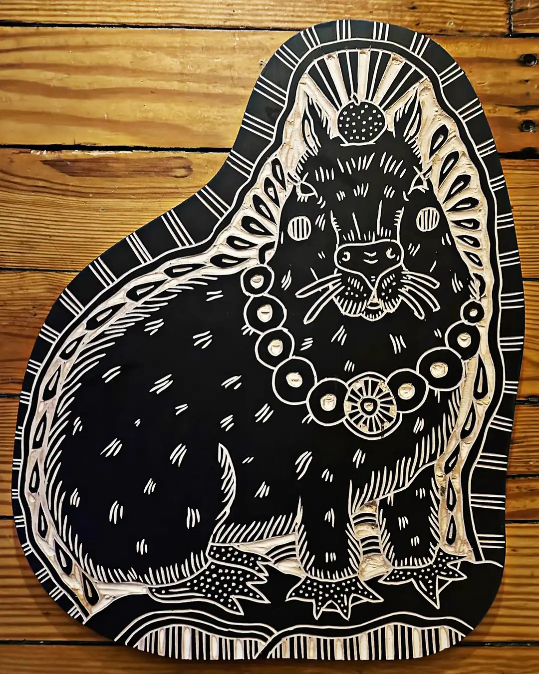 Bryn Perrott, aka Deerjerk, is best known for her striking, immensely detailed high-contrast woodcuttings and prints. Her work has been used as beer labels, band merchandise, tattoos, and more. Bryn’s relief carvings feature themes like animals, death, and religion with a folk art feel that often mix cuteness with gore.