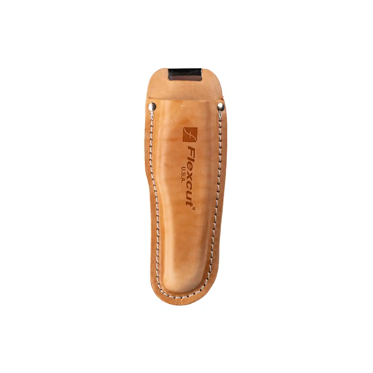 This molded leather sheath will fit any standard knife profile (does not fit mini-knives, KN33 Hooked Push Knife, or scorps). A blade stop is fixed at the bottom of the sheath to keep the point from cutting through. The metal belt clip attaches easily to any belt style.