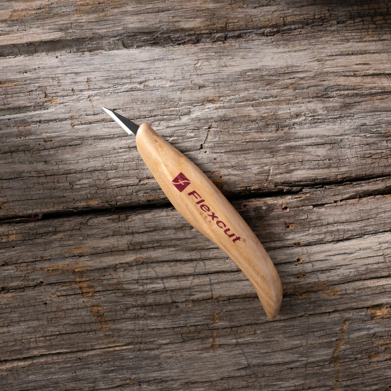 The Mini-Detail Knife has a straight blade. It is made from ultra-thin material to not disturb adjacent wood for very delicate cuts. The smaller handle is faceted with multiple control points to allow it to be held in a variety of comfortable positions.