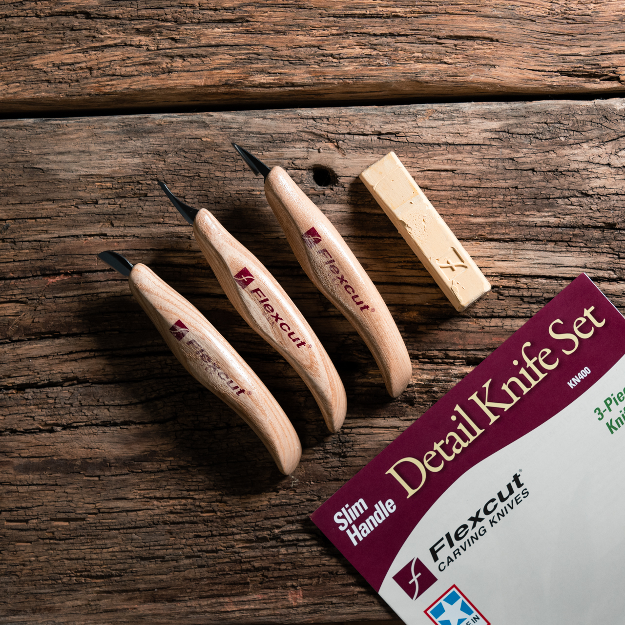 Our Slim-Handle Detail Knife Set is the perfect addition to your tool roll. These knives have the same high quality as other Flexcut knives, but the blades are smaller to handle the finest of detail work. A small bar of Polishing Compound is included to help maintain your knife edges.