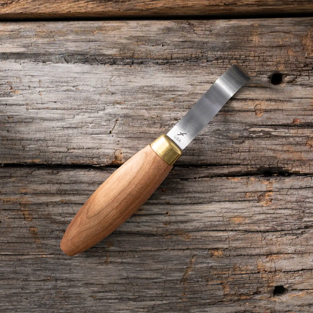 The Double Bevel Sloyd Hook Knife is ideal for carving spoons, bowls, ladles and other deep hollowed work. It features a double-sided blade with a round, sharpened end. For added strength, the tang of each knife extends completely through the beautifully conditioned Cherry hardwood handle. It also features a brass ferrule for added stability. The overall length of this knife is 8-1/2” with a radius of .75”.
