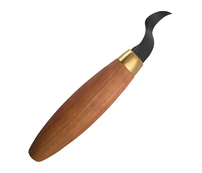 Got curvy nooks and crannies to carve? The KN54 Spear Point Small Radius Hook Knife will get the job done. The deeply swept small radius hook is great for carving hard to reach hollow areas in deep ladles, soup spoons and bowls. On top of that, the razor-sharp recurved spear point tip gives this hook an unmatched versatility for detail carving from all angles. A double-edged design means you’re good to go whether right or left handed. From top to bottom this premium quality tool comes laser sharp and built to last. Precision ground steel, through-tang construction, brass ferrule and conditioned cherry handle - Premium materials mean this tool will develop a gorgeous patina while it keeps you carving the good stuff.